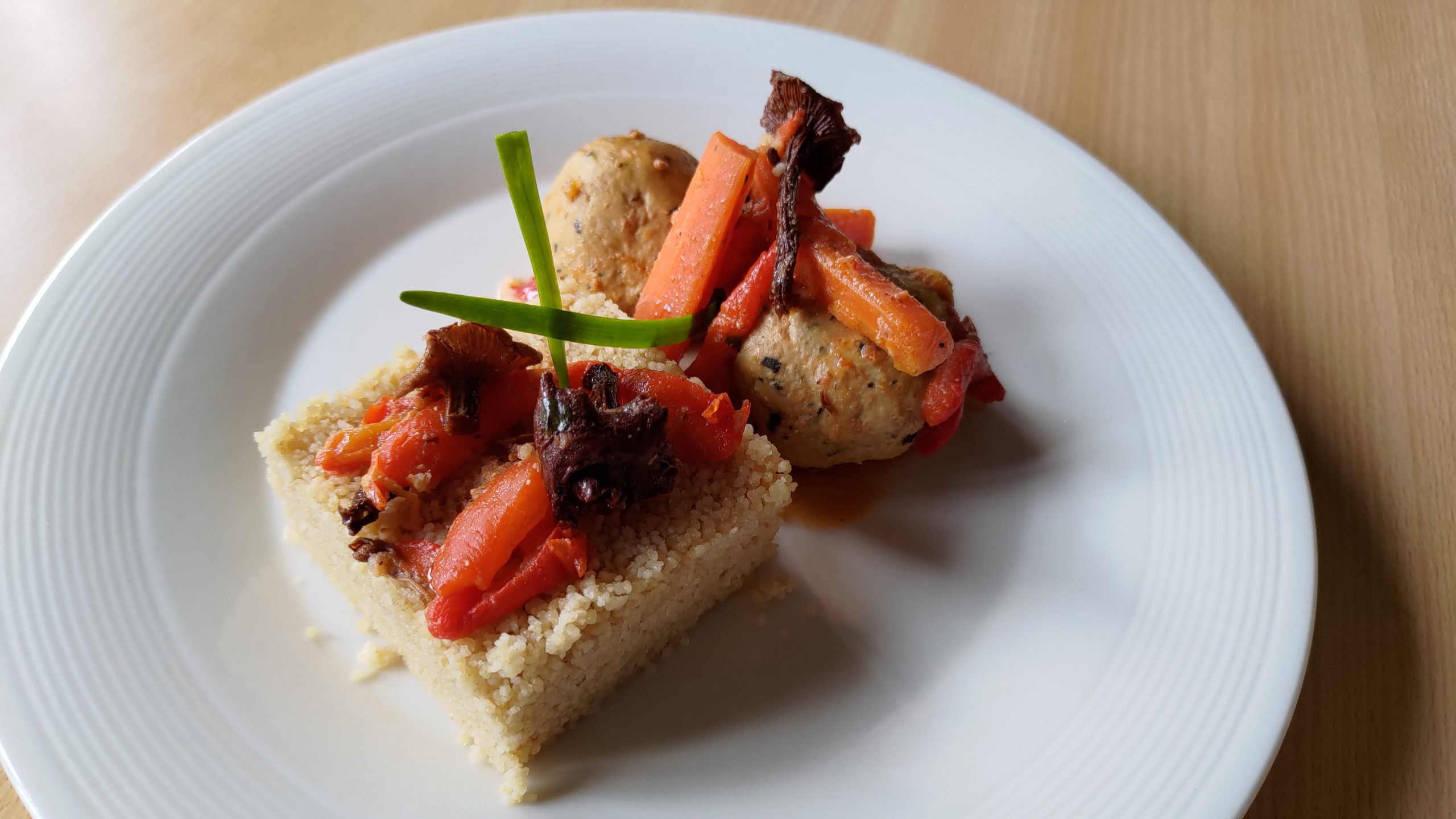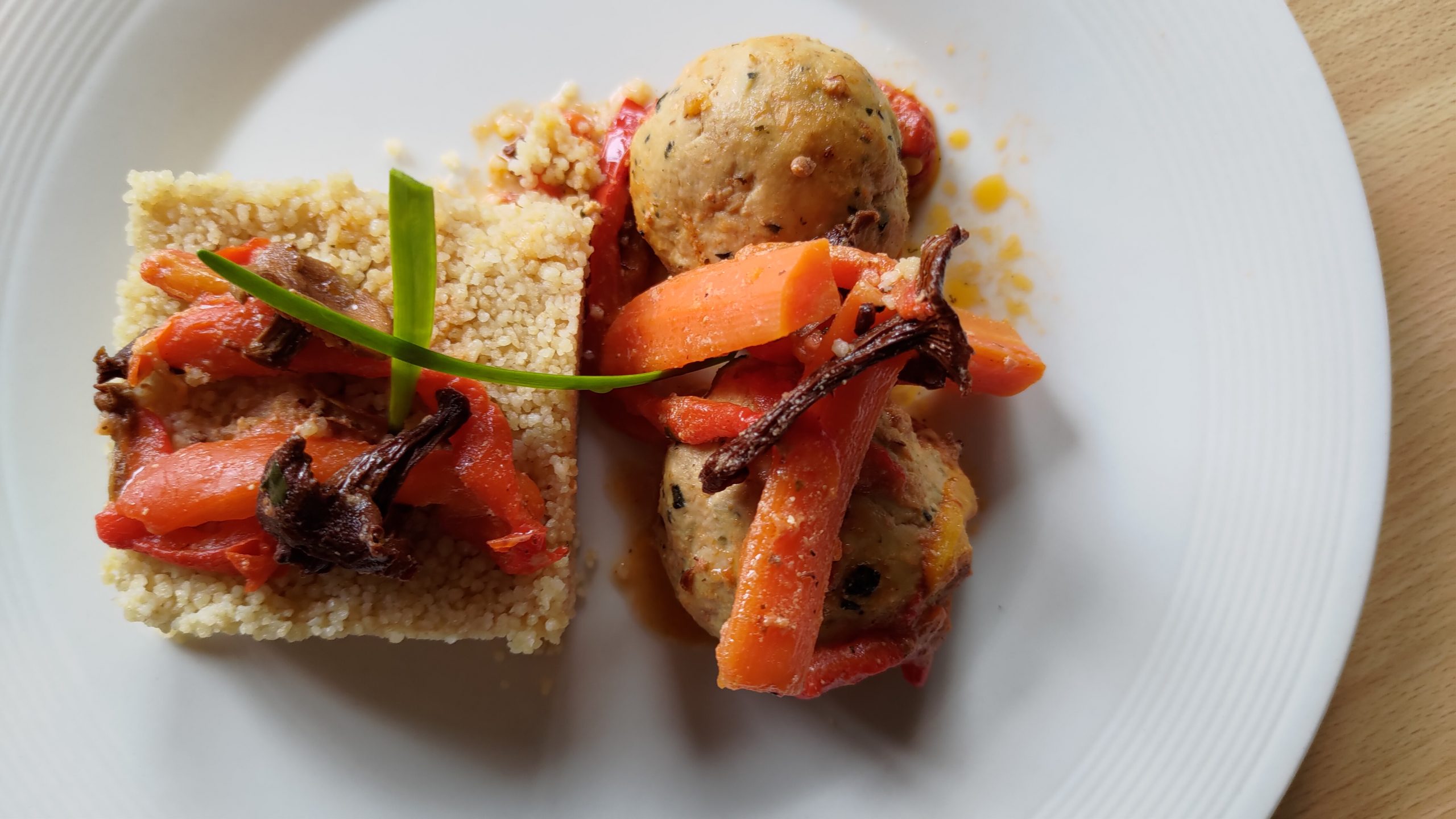 Servies avec un généreux couscous de quinoa accompagné de légumes fondants (carottes, poivrons, champignons), ce plat coloré et délicatement parfumé offre une expérience culinaire saine et gourmande, mêlant subtilement influences africaines et méditerranéennes.