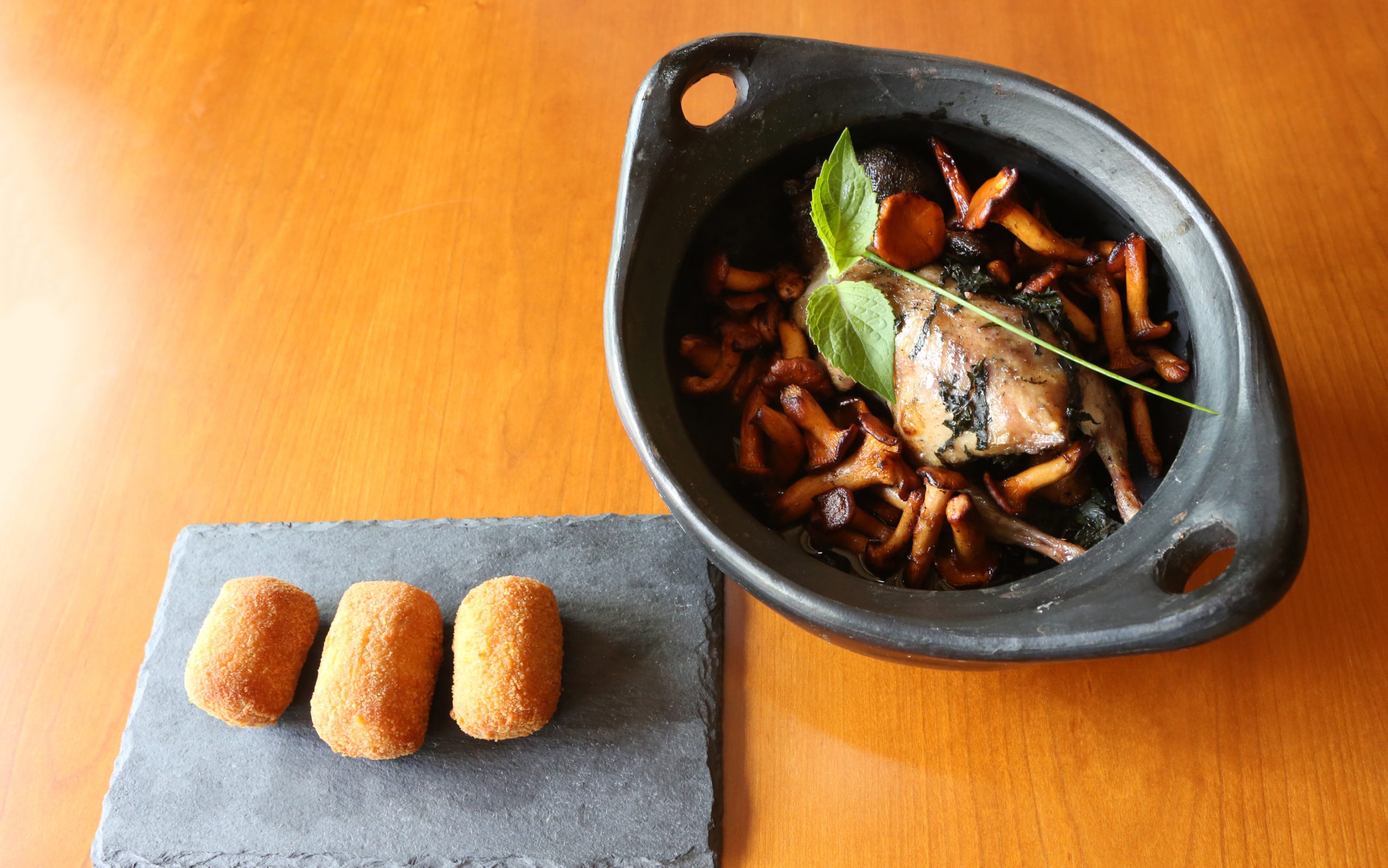 Découvrez notre délicate Caille au lumba lumba, mijotée aux feuilles aromatiques typiques du Congo et accompagnée de girolles savoureuses, servie avec de délicieuses croquettes croustillantes. Une création raffinée, riche en saveurs et en élégance.