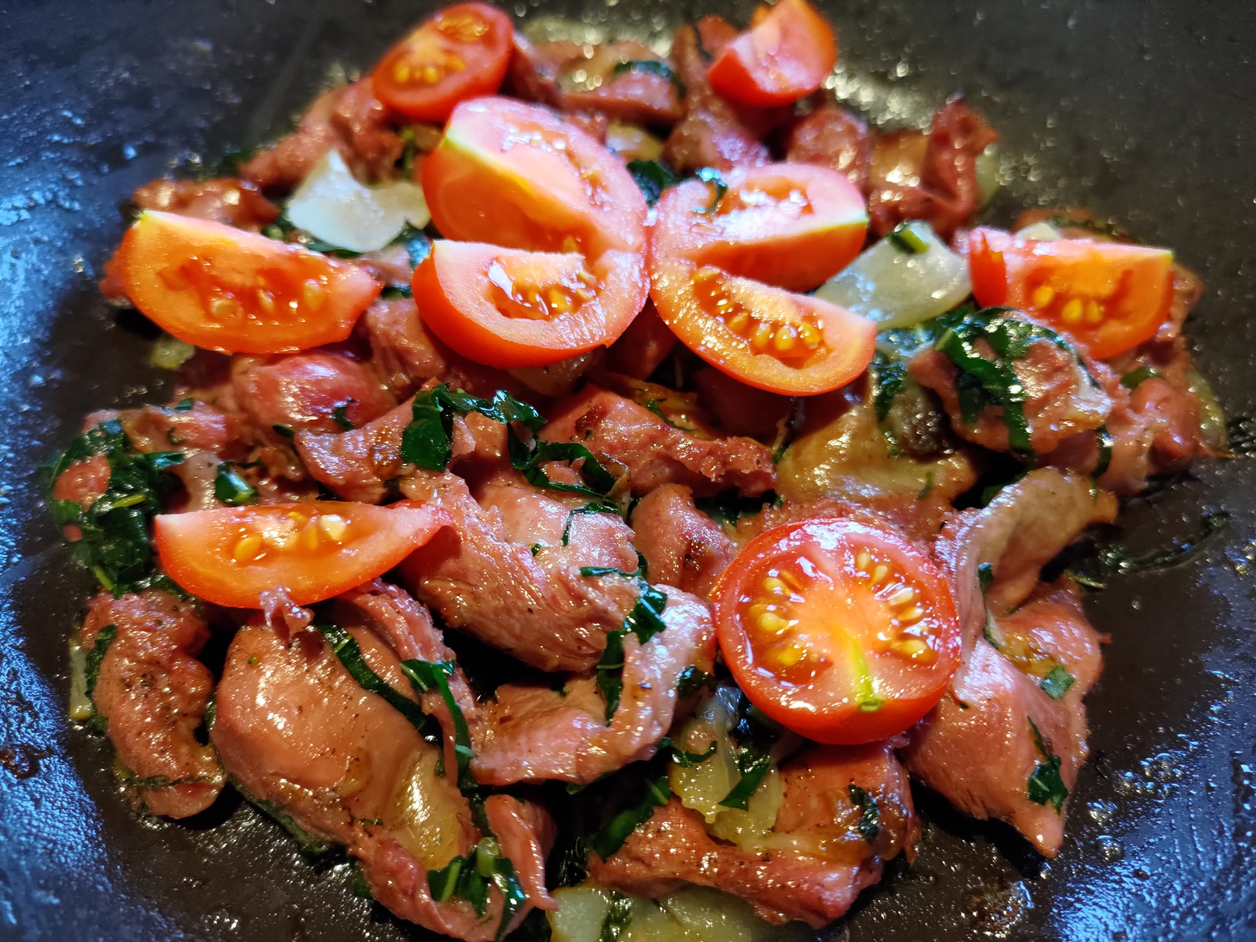 Gésiers de poulet sautés au lumba lumba (basilic africain), tomates cerises, oignons.